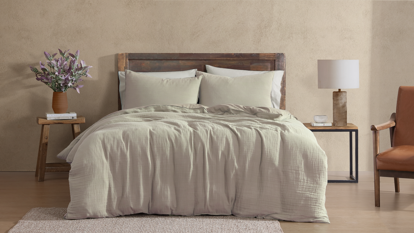 The Earth Quilt Cover Set offers natural texture and comfort with its beautifully soft design. The front is crafted from 100% cotton double gauze, giving it a lightweight, airy feel with a relaxed, crinkled finish, while the reverse is made from smooth 100% cotton for added softness against the skin. Effortlessly stylish and breathable, it’s the perfect blend of comfort and understated elegance for everyday living.